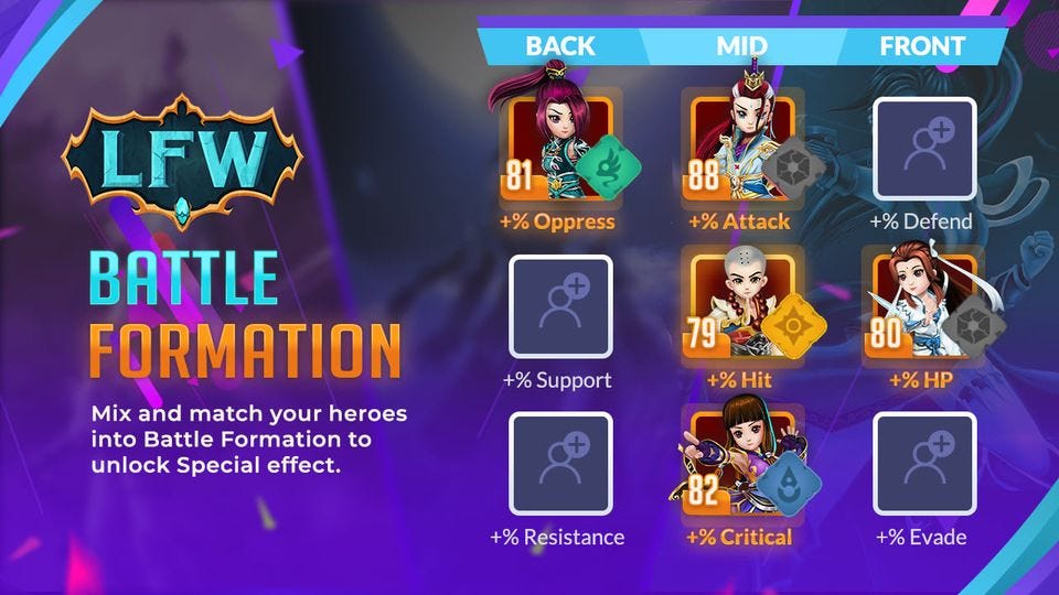 Legend of Fantasy War (LFW) is a turn-based role-playing game, combining many gameplay models of the new generation card game series. The members of the squad (Heroes) are recruited by players, it also affects the ecosystem and users’ freedom in the game.